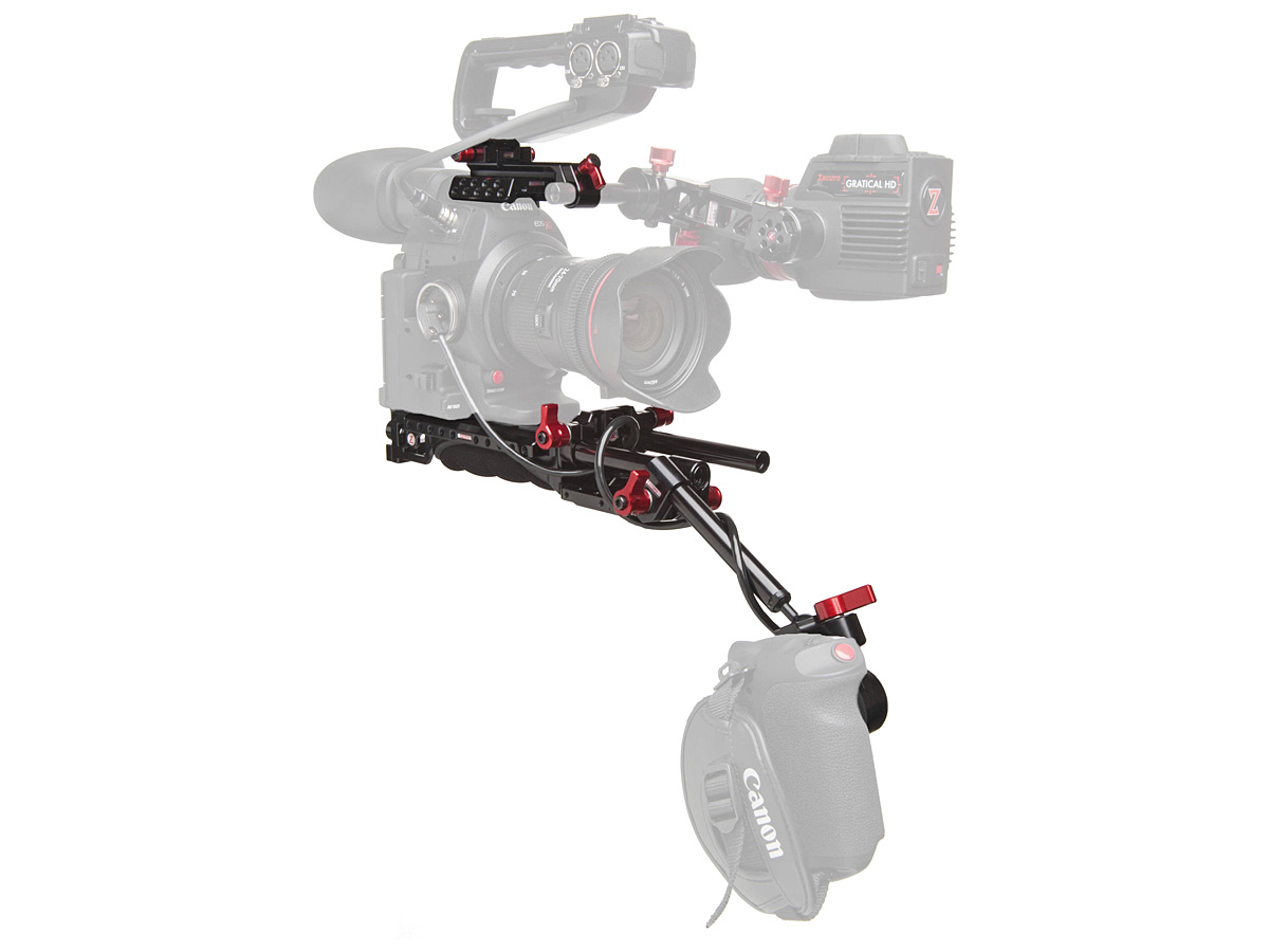 The Zacuto C100 Mark II EVF Recoil is a shoulder-mounted rig designed specifically for the Canon C100 Mark II. It features a VCT Universal baseplate, a C100 Mark II Helmet, and a Zgrip Relocator. The Helmet allows for a secure connection between the camera body and the Canon top handle while also providing a 15mm rod port for the optional Axis Mini and multiple 1/4"-20 screw holes for mounting accessories. The Zgrip Relocator re-positions the camera's handgrip for comfortable shooting and camera control.